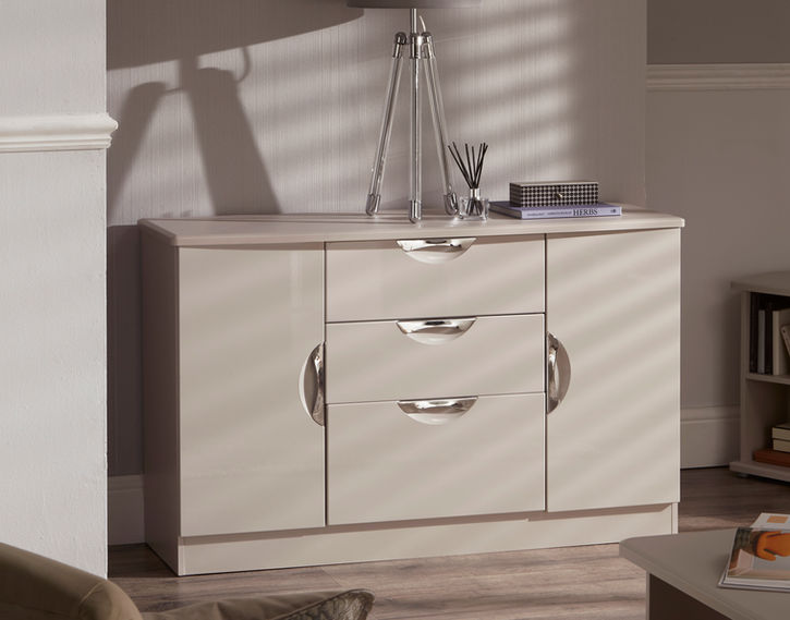 Boasting a clean, contemporary look and pleasing practicality, this furniture range makes a seamless addition to any modern looking home. The range offers an array of practical, organised space. All pieces have a scratch-resistant veneer to help prevent the wear and tear that comes with everyday usage, while the gloss drawers and doors are complemented by distinctive cut-out handles and a smooth wood finish for a great mix of style and functionality.