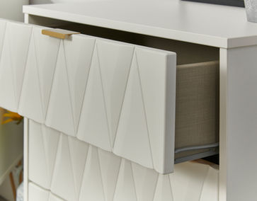 Say hello to contemporary cool with the Diamond range, with distinctive patterned drawers and a variety of colour options available to compliment any interior design. Gold metal handles and sturdy hairpin legs complete the storage solution.